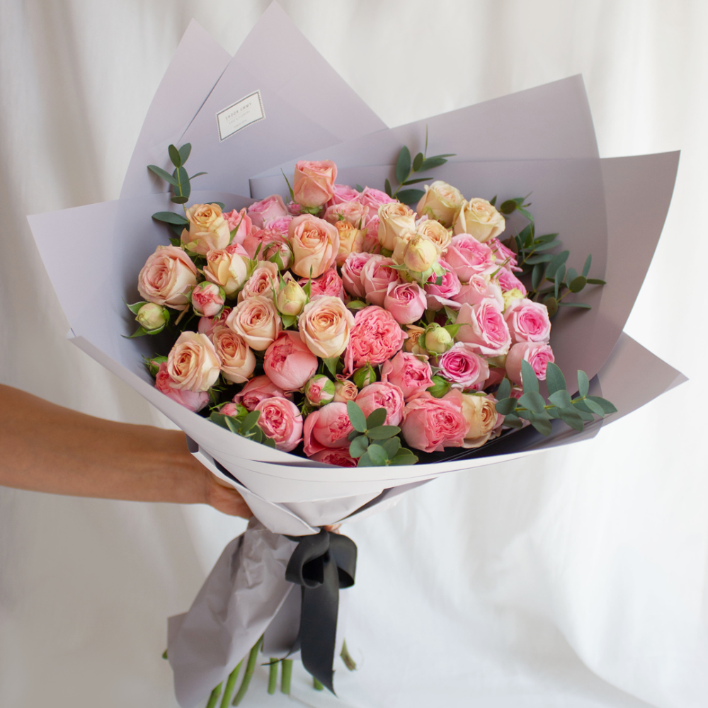 30 غصن من البيبي روز واوراق الايكلوبتس الخضراء مغلفة بطريقة أنيقة ،مربوطة بشريطة ساتان .