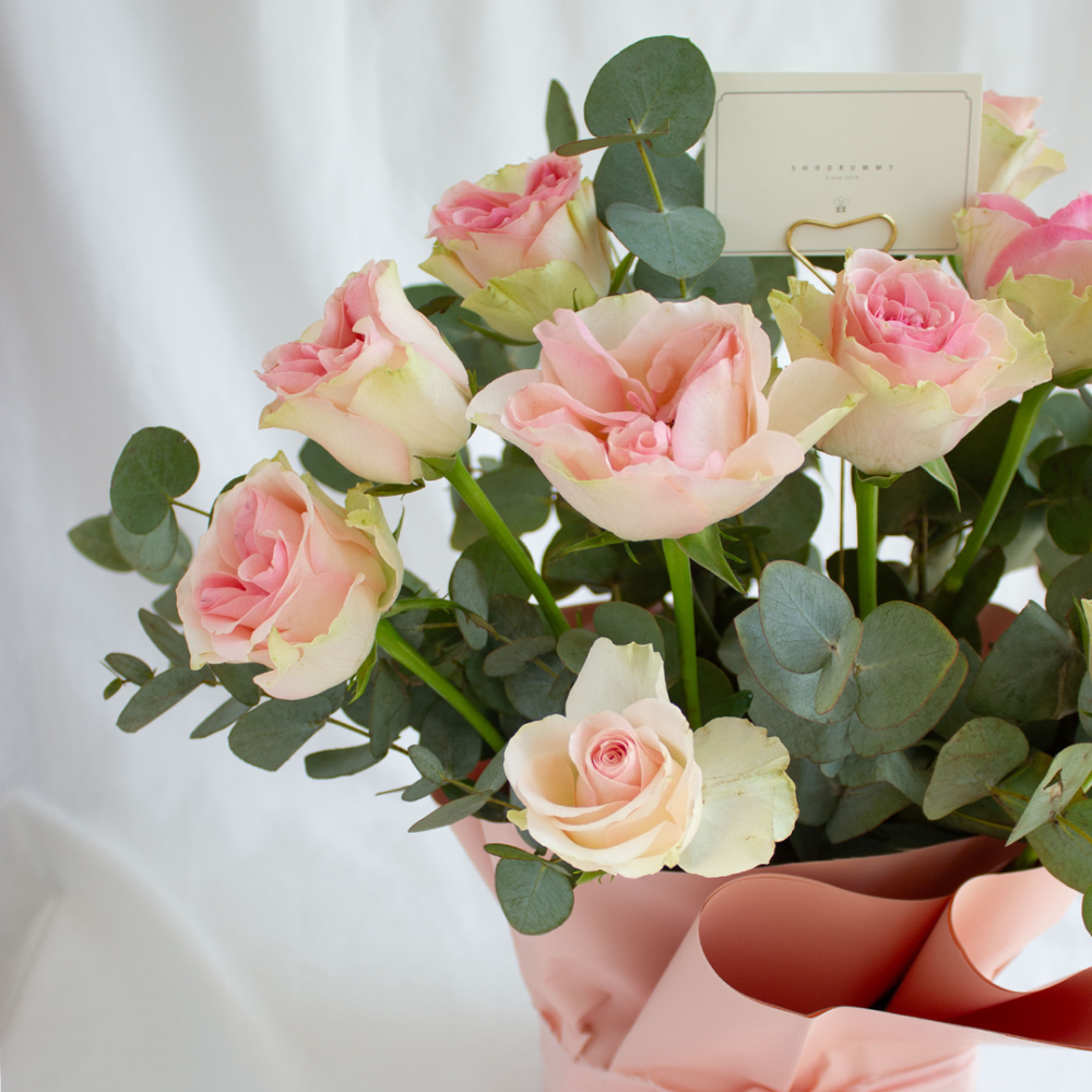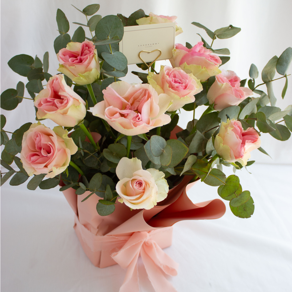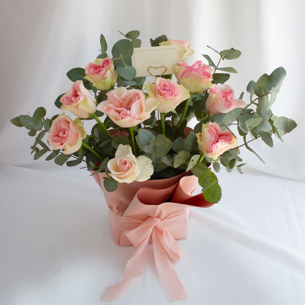 10 اغصان من الروز واوراق الايكلوبتس الخضراء مثبته على قاعدة بطريقة أنيقة ،مربوطة بشريطة قماشية.
