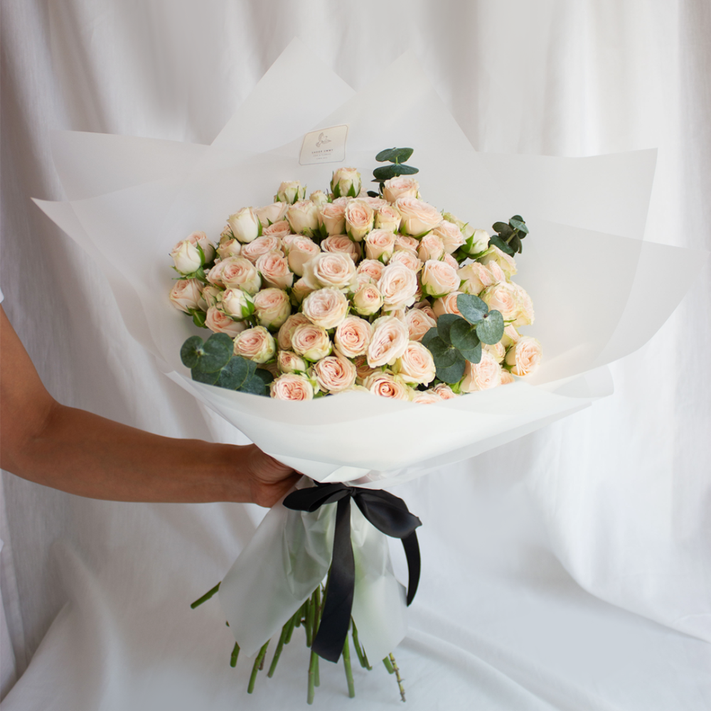 30 غصن من البيبي روز واوراق الايكلوبتس الخضراء مغلفة بطريقة أنيقة ،مربوطة بشريطة ساتان .