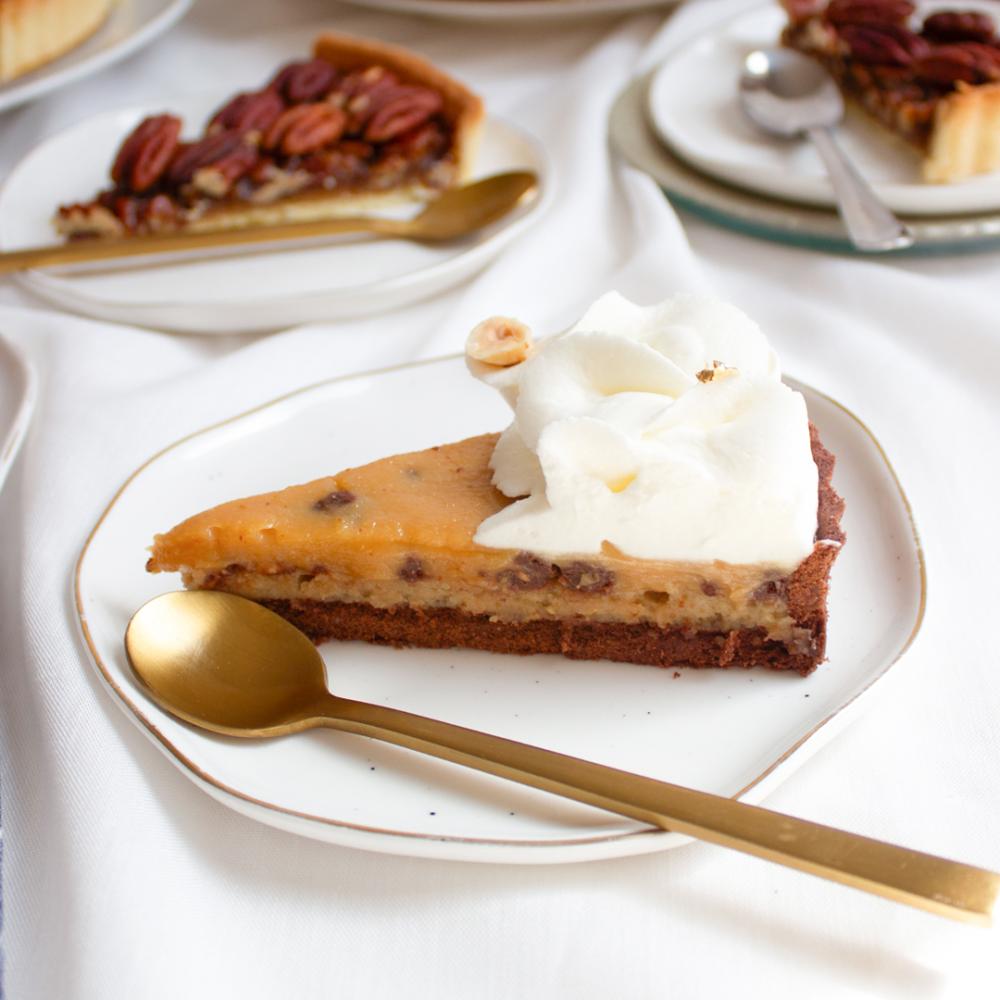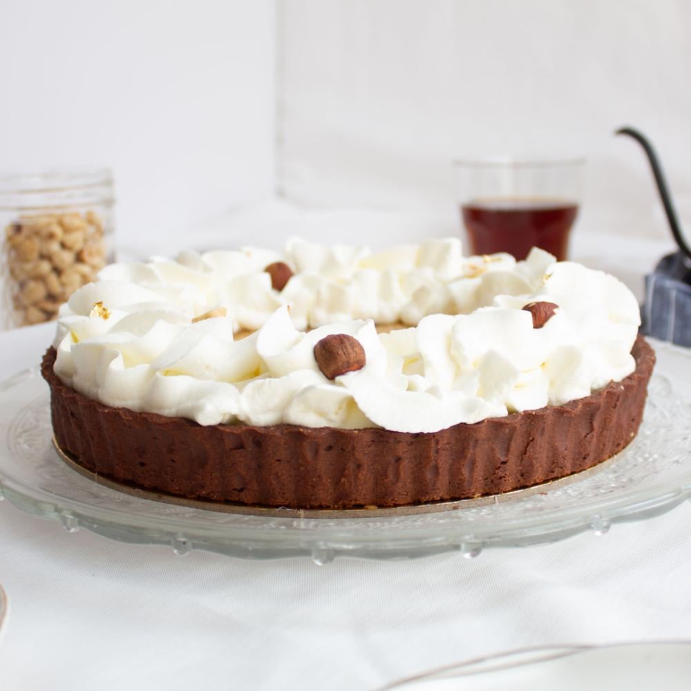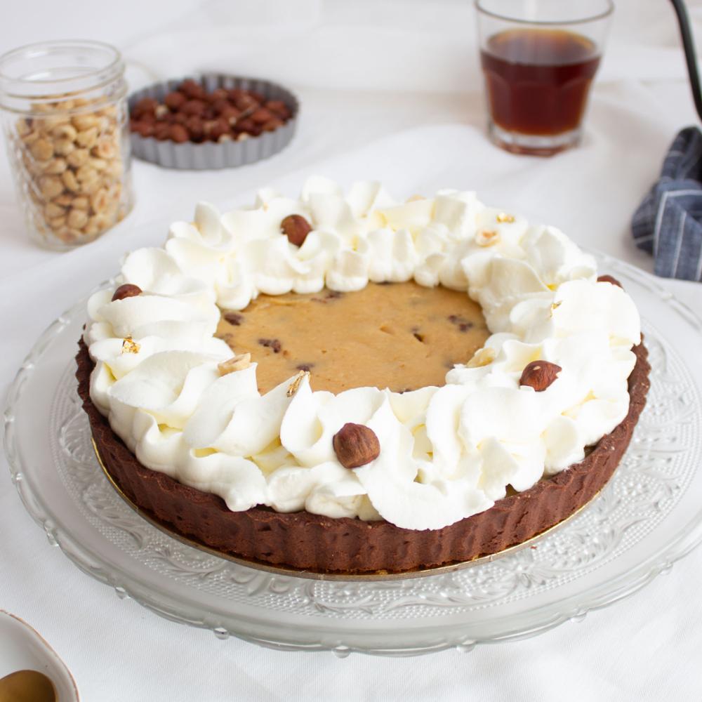 سابلية الشكولاتة محشي بطبقة كريمة البندق و كرامبل شكولاته بالبندق المحمص ثم طبقة اخرى من الباستري كريم ببرالين البندق مزين بكريم تشيز غني وحبات من البندق و ورق الذهب.