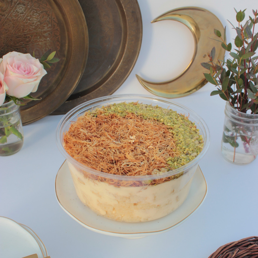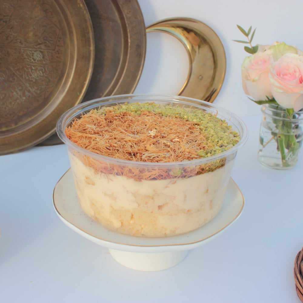 ترايفل بنكهة شرقية، طبقات من الكيك والكريمة الغنية و حبات من الجوز المكرمل وطبقة اخيرة من الكنافة مقرمشة ، مزينة بهلال من الفستق الحلبي.