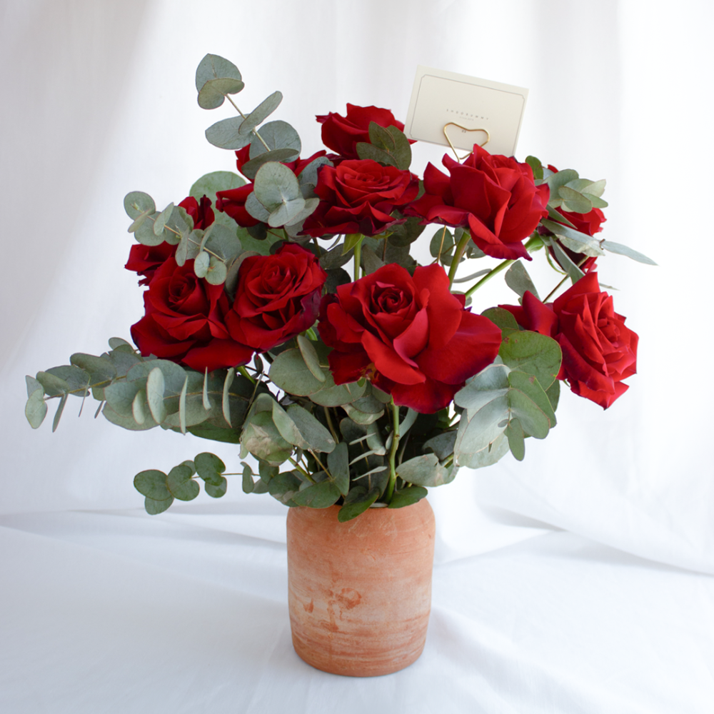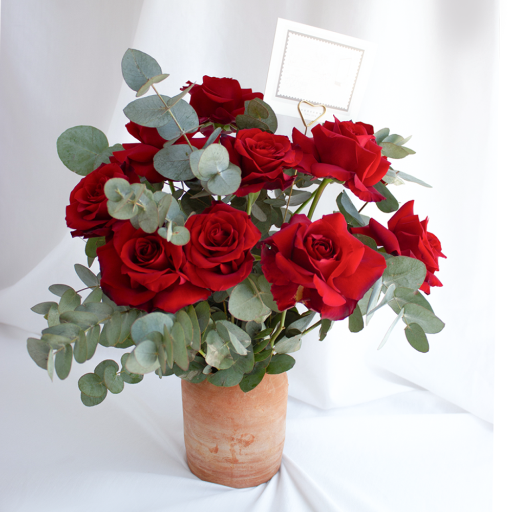 اصيص فخاري يحتوي على 10 غصن من الروز و اوراق الايكلوبتس الخضراء .