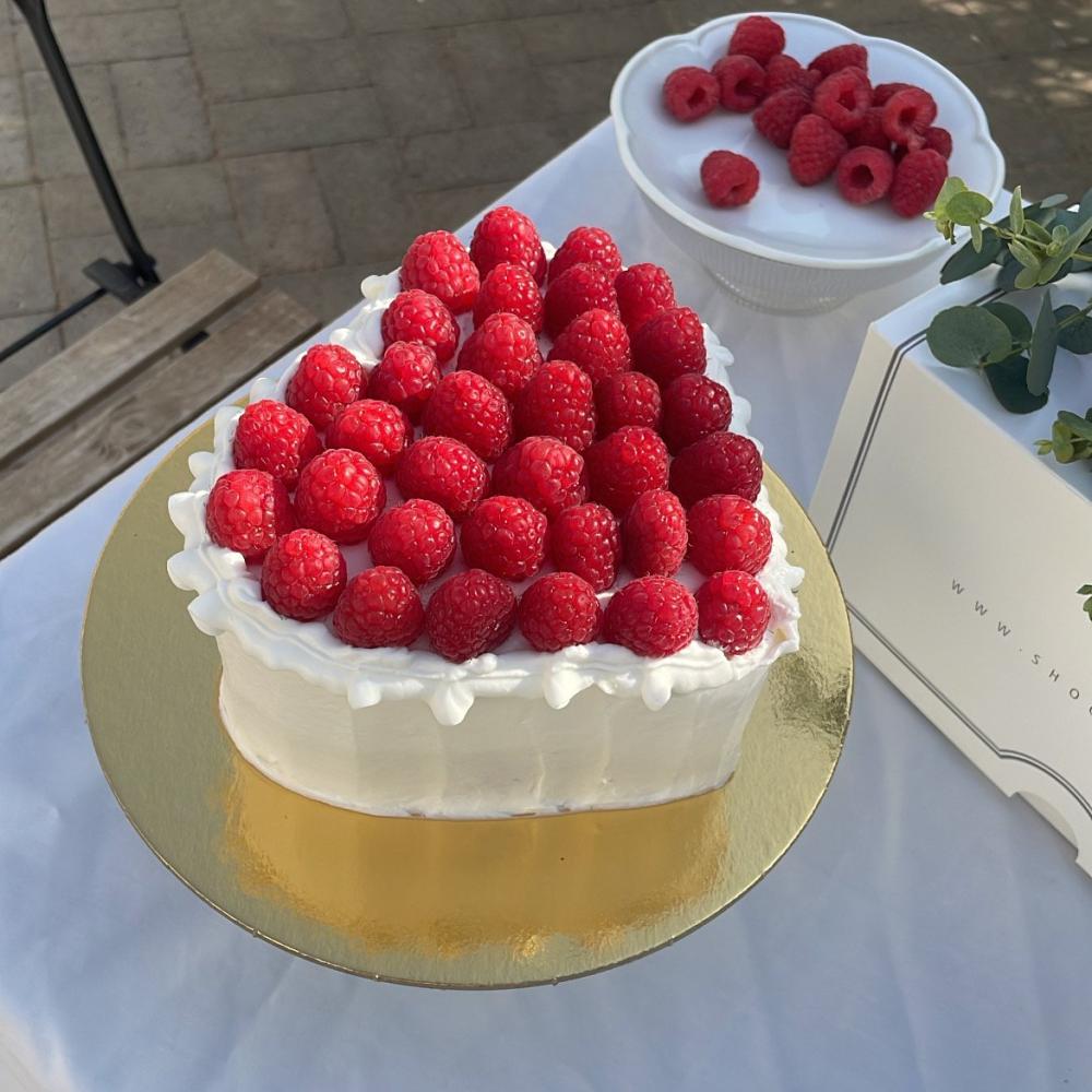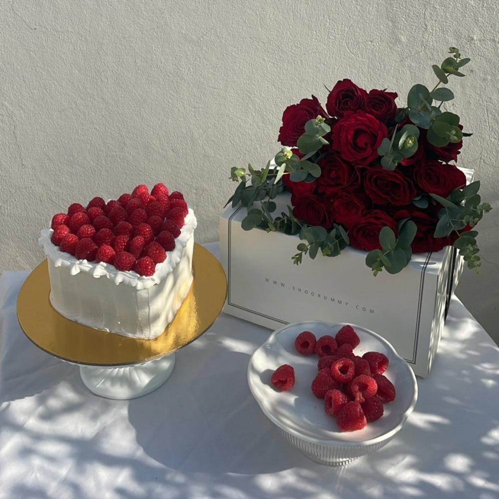 طبقتين من كيك الفانيلا الاسفنجي على شكل قلب و حشوة بيوريه التوت الاحمر المعد في معملنا مغطى بالتشيز كريم و مزينه بحبات التوت الطبيعي.