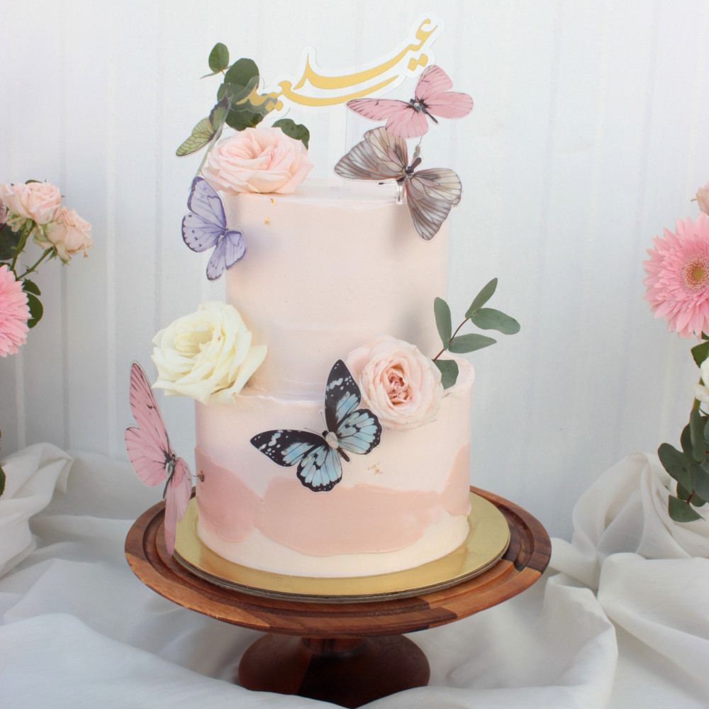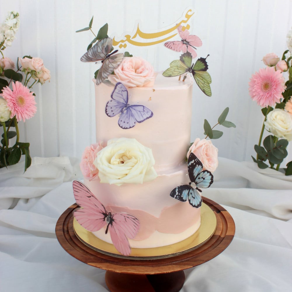 طبقات من كيك الفانيليا الاسفنجي وحشوة حسب اختيارك مغطاة بكريمة التشيز بالشانتيه مزينه بالورد الطبيعي والفراشات .